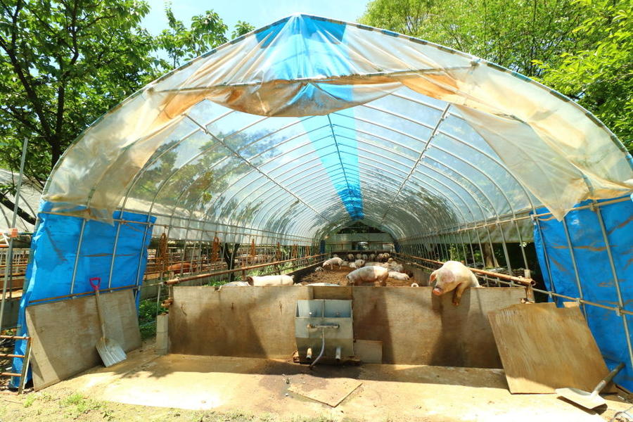 思春期には広いハウスで育て、ハウスの端っこに水、その反対側の端っこに餌を置きます。こうすることで豚はご飯を食べるときには餌→水→餌→水と、自然と運動をするようになるのです。